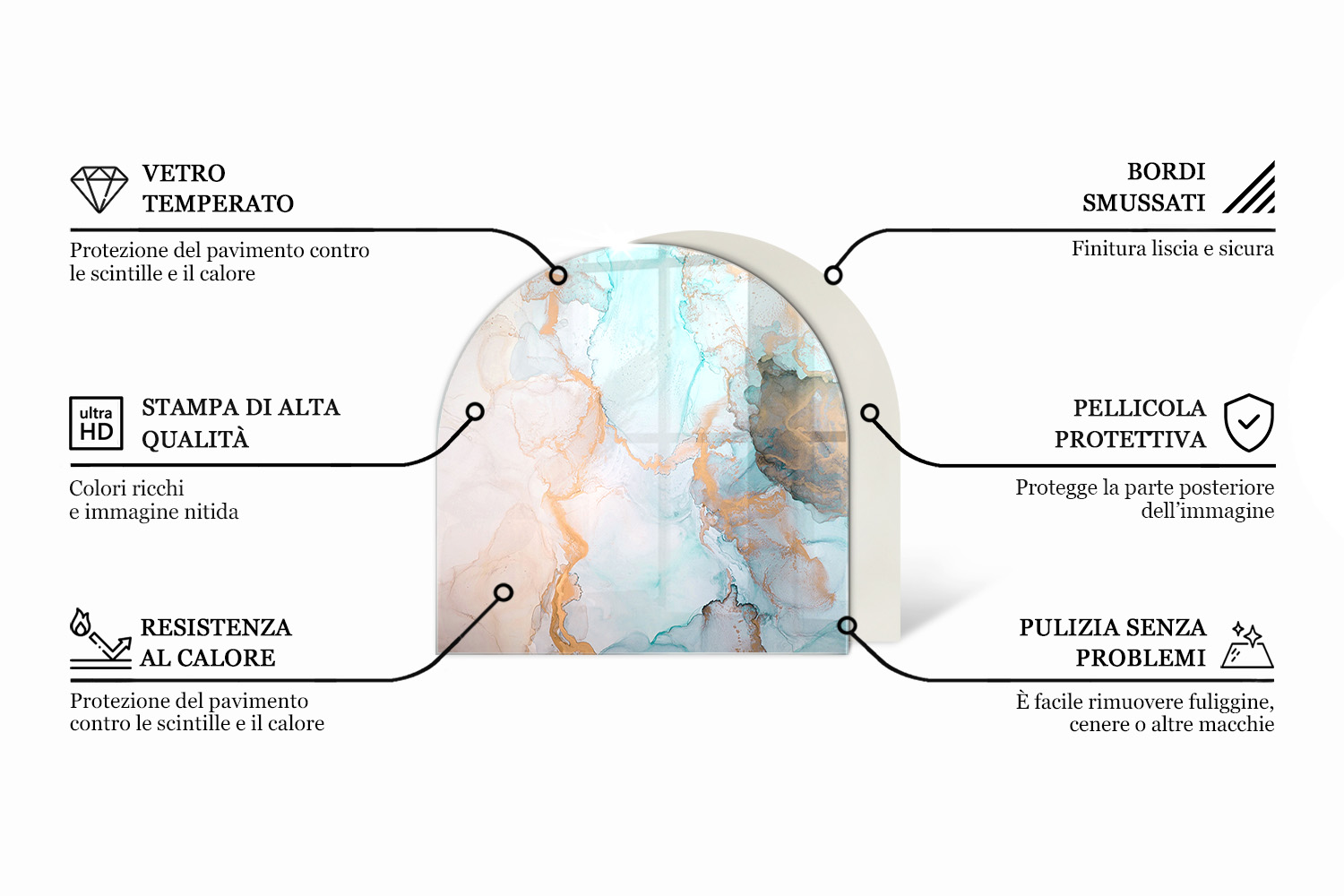 La nostra lastra in vetro per caminetto svolge un ruolo protettivo essenziale. Salvaguarda efficacemente il tuo pavimento – che sia parquet, legno o piastrelle – dallo cenere e dal calore. La superficie liscia di questo vetro sotto stufa rende la pulizia estremamente semplice. Il prodotto è dotato di piedini in silicone, che garantiscono stabilità e prevengono lo scivolamento.