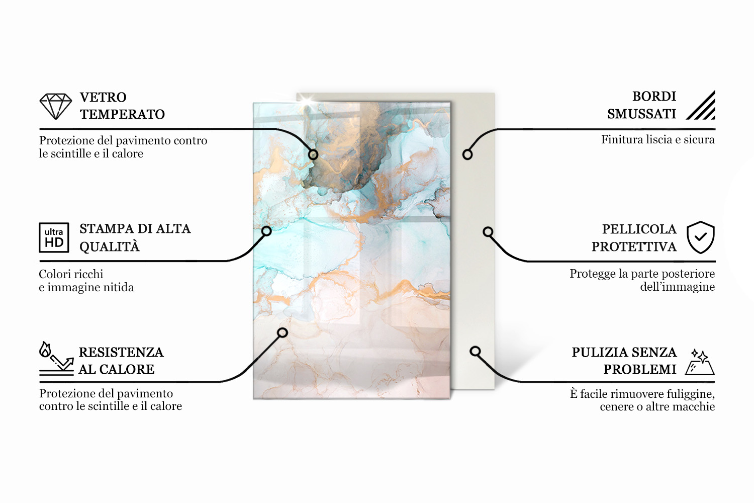 Il prodotto è realizzato con cura dei dettagli. Una stampa di alta qualità, bordi lisci e piedini in silicone sono la garanzia della tua soddisfazione. Come vetro sotto stufa, isola ottimamente il pavimento dal calore e dallo sporco. Puoi mantenerla pulita molto facilmente, usando solo un panno morbido.